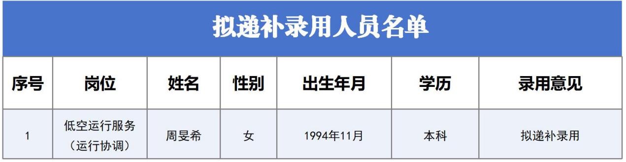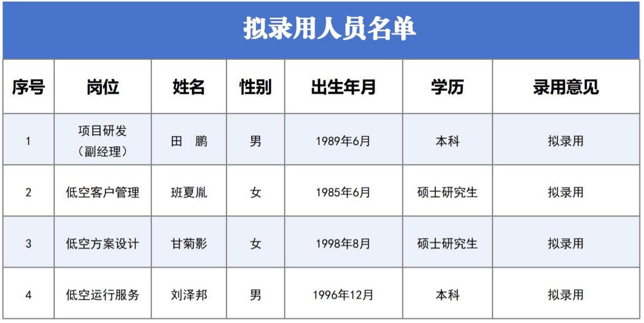江苏航空产业集团有限责任公司2025年度人才招聘工作已结束,本次计划招聘的项目研发(副经理)1人、低空客户管理1人、低空方案设计1人、低空运行服务(运行协调)2人,按照招聘各环节的工作要求,组织完成资格审查、笔试、面试,并根据综合成绩排名和体检情况,确定拟录用人员4名,拟递补录用人员1名,现予以公示: